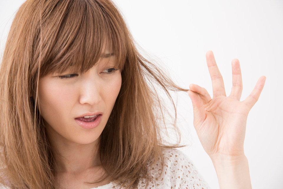 髪内部の水分が奪われ、髪が硬くなり、ゴワつきや枝毛・切れ毛の原因となります。